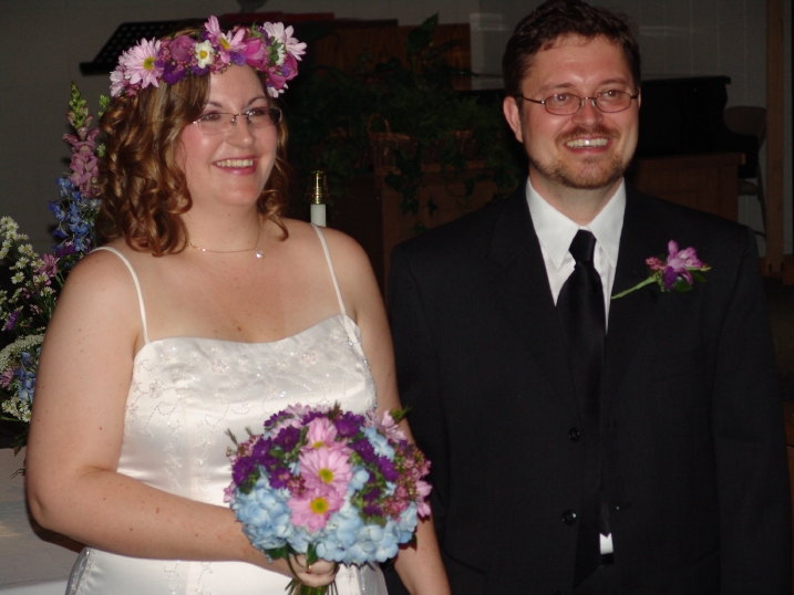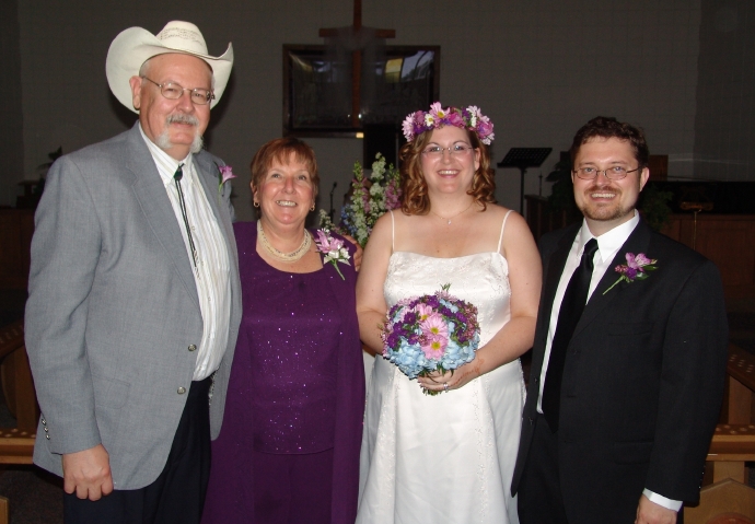 The marriage unfolded over a period of two days. For some complex reasons not necessary to explain here, the "official" marriage took place on Friday (28 April) in a small church in north Oklahoma City. It was a small ceremony, with only family in attendance, officiated by Pastor Peggy Risenhoover, a Methodist minister-in training, and longtime friend of Heather's. The vows were something special, apparently derived from some materials found on the Web, but they were especially apt for this particular couple. It was an emotional experience for us all, but a happy one. Pictures during the ceremony were prohibited, but afterward, the orgy of photography began ..
